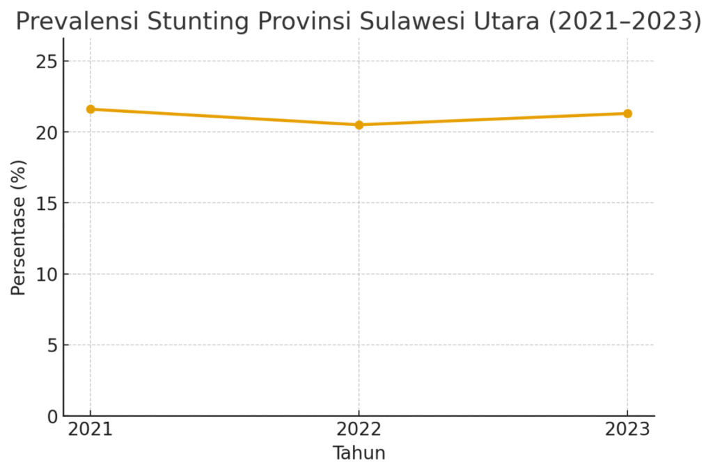 Gambar 1. Tren prevalensi stunting Provinsi Sulawesi Utara (2021–2023). Sumber: SSGI 2021–2022, SKI 2023.