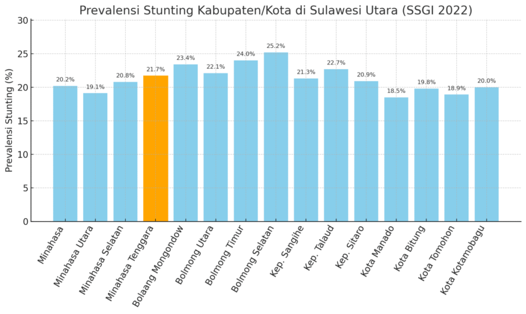 Jika dibandingkan dengan kabupaten/kota lain di Sulawesi Utara, prevalensi stunting di Minahasa Tenggara tercatat 26,5 % (SSGI 2022). Angka ini lebih tinggi dibanding Kota Manado (18,5 %) maupun Kota Tomohon (18,9%), tetapi sedikit lebih rendah dari Bolaang Mongondow Selatan (25,2 %).